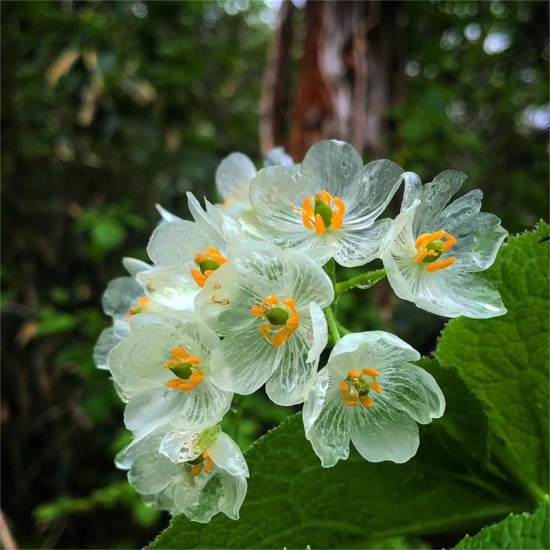 Diphylleia grayi, also known as "skeleton flower" or "crystal flower", is a perennial plant native to the mountainous regions of East Asia, especially Japan and China. It is famous for its delicate white flowers that become transparent when exposed to water.